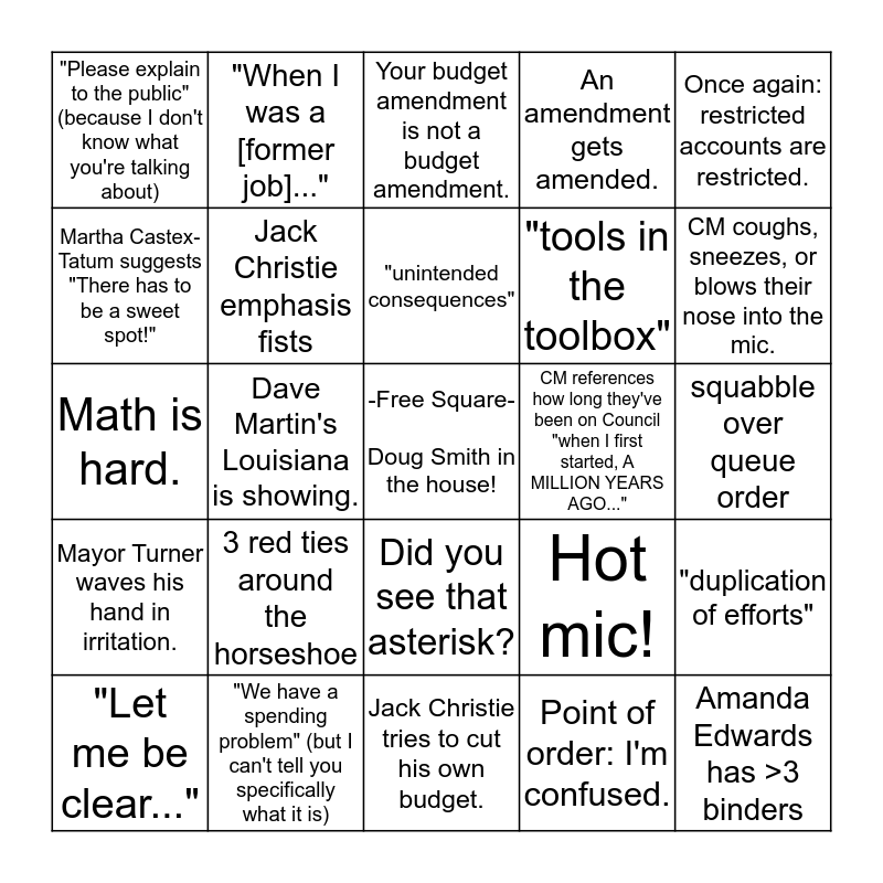 This bingo card has a free space and 24 words: 3 red ties around the horseshoe, "We have a spending problem" (but I can't tell you specifically what it is), "unintended consequences", "Let me be clear...", Once again: restricted accounts are restricted., "Please explain to the public" (because I don't know what you're talking about), Martha Castex-Tatum suggests "There has to be a sweet spot!", "When I was a [former job]...", CM references how long they've been on Council "when I first started, A MILLION YEARS AGO...", Did you see that asterisk?, "tools in the toolbox", Math is hard., Hot mic!, "duplication of efforts", Jack Christie emphasis fists, Point of order: I'm confused., squabble over queue order, Your budget amendment is not a budget amendment., CM coughs, sneezes, or blows their nose into the mic., Dave Martin's Louisiana is showing., Amanda Edwards has >3 binders, Mayor Turner waves his hand in irritation., An amendment gets amended. and Jack Christie tries to cut his own budget..
