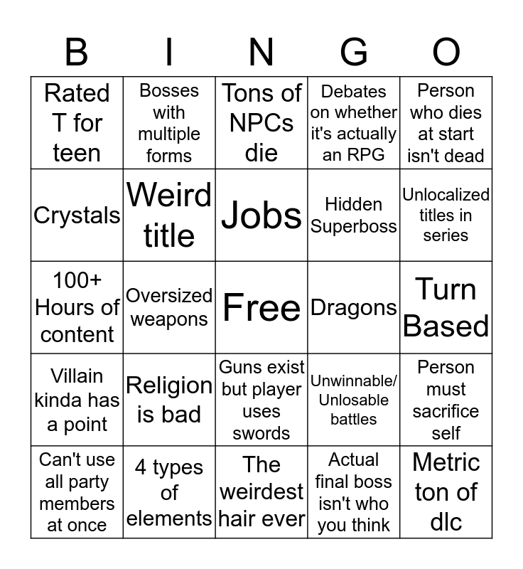 This bingo card has a free space and 24 words: Religion is bad, 4 types of elements, Jobs, Can't use all party members at once, Person who dies at start isn't dead, Rated T for teen, Crystals, Bosses with multiple forms, Dragons, Guns exist but player uses swords, Hidden Superboss, 100+ Hours of content, Unwinnable/ Unlosable battles, Person must sacrifice self, Weird title, Actual final boss isn't who you think, Turn Based, Tons of NPCs die, Unlocalized titles in series, Oversized weapons, Metric ton of dlc, Villain kinda has a point, Debates on whether it's actually an RPG and The weirdest hair ever.