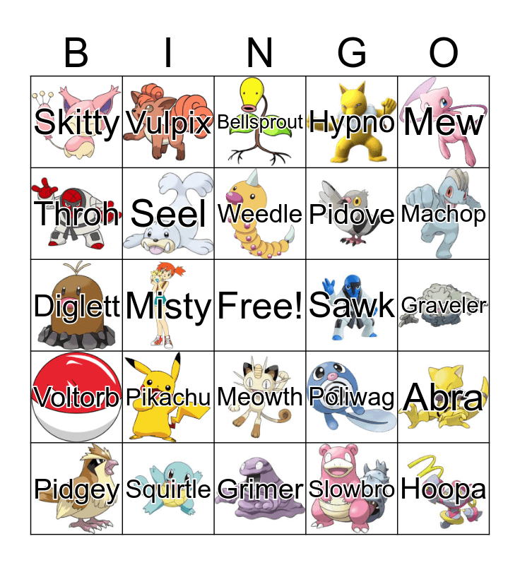 This bingo card has 24 images, a free space and 24 words: Pikachu, Squirtle, Weedle, Pidgey, Mew, Skitty, Throh, Vulpix, Sawk, Meowth, Pidove, Diglett, Poliwag, Abra, Seel, Slowbro, Graveler, Bellsprout, Machop, Misty, Hoopa, Voltorb, Hypno and Grimer.