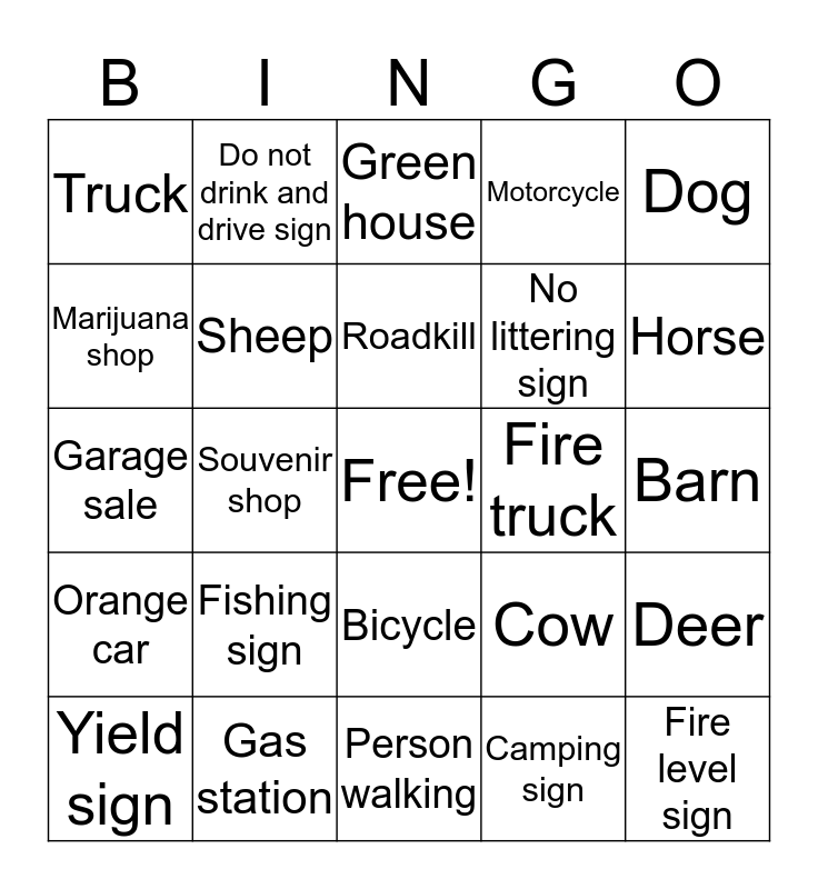 This bingo card has a free space and 29 words: Hawk, Gas station, Green house, Police car, Dog, Truck, Sheep, Roadkill, Fire truck, Deer, Yield sign, Souvenir shop, Camping sign, Fire level sign, Garage sale, School bus, Person walking, Cow, Horse, Orange car, Fishing sign, Boat, No littering sign, Barn, Marijuana shop, Do not drink and drive sign, Bicycle, Motorcycle and Helicopter.