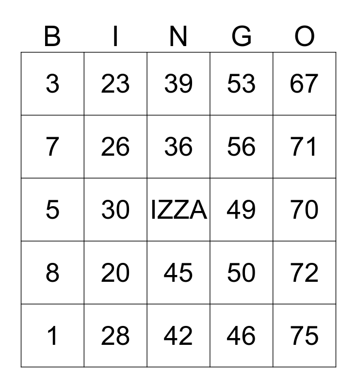 This bingo card has a free space and 24 words: 1, 20, 36, 46, 67, 3, 23, 39, 49, 70, 5, 26, 50, 72, 7, 28, 42, 53, 71, 8, 30, 45, 56 and 75.