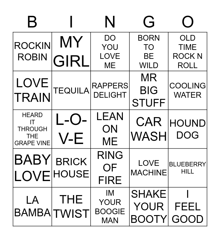 This bingo card has a free space and 26 words: RING OF FIRE, SHAKE YOUR BOOTY, RAPPERS DELIGHT, THE TWIST, OLD TIME ROCK N ROLL, ROCKIN ROBIN, LOVE TRAIN, MY GIRL, HOUND DOG, LOVE MACHINE, MR BIG STUFF, HEARD IT THROUGH THE GRAPE VINE, BLUEBERRY HILL, LA BAMBA, L-O-V-E, CELEBRATION, BORN TO BE WILD, BABY LOVE, DO YOU LOVE ME, I FEEL GOOD, COOLING WATER, IM YOUR BOOGIE MAN, CAR WASH, BRICK HOUSE, TEQUILA and WE ARE FAMILY.