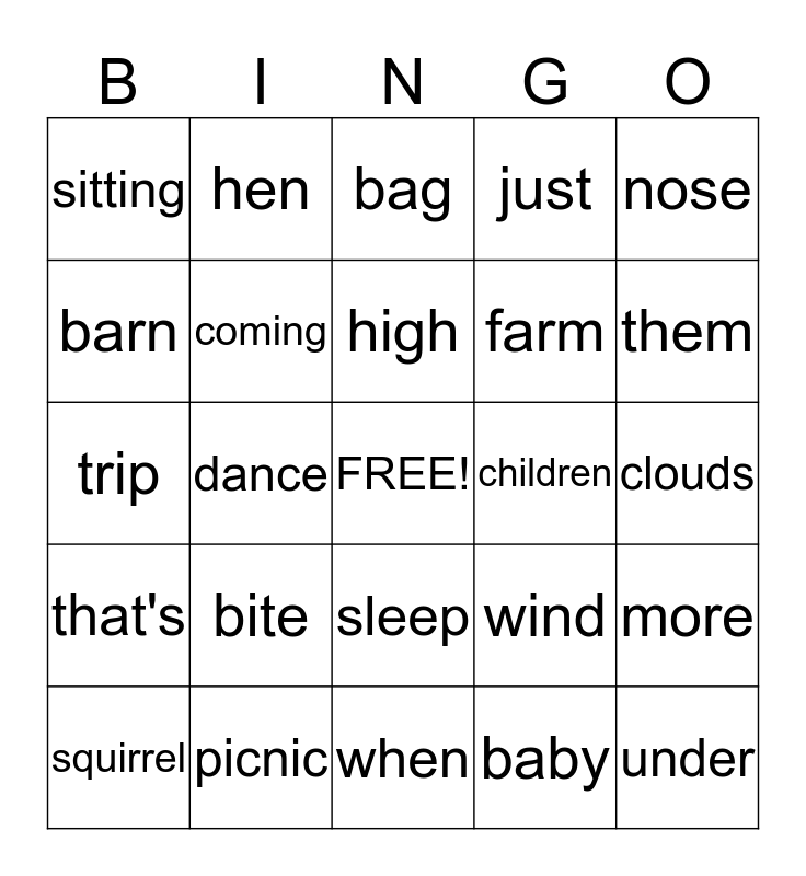 This bingo card has a free space and 24 words: bite, picnic, high, squirrel, nose, sitting, barn, hen, children, sleep, farm, trip, wind, more, coming, baby, clouds, bag, them, dance, under, that's, just and when.