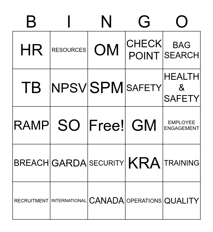 This bingo card has a free space and 29 words: RECRUITMENT, PEARSON, SO, GREVIENCE, HR, OM, NPSV, GARDA, GM, INTERNATIONAL, EMPLOYEE ENGAGEMENT, QUALITY, CANADA, OPERATIONS, HEALTH & SAFETY, LIVING THE DREAM, SECURITY, BREACH, BAG SEARCH, RAMP, KRA, ACCOMODATIONS, SAFETY, TB, CHECK POINT, RESOURCES, TRAINING, SPM and AIRPORT.