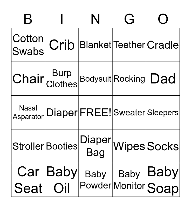 This bingo card has a free space and 33 words: Pacifier, Rattle, Diaper, Milk Bottle, Stroller, Burp Clothes, Cradle, Car Seat, Crib, Rocker, Bodysuit, Blanket, Mittens, Toys, Sweater, Dad, Baby Oil, Nasal Asparator, Booties, Wipes, Diaper Bag, Mother, Cotton Swabs, Sleepers, Baby Powder, Baby Soap, Teether, Rocking, Chair, Socks, Thermometer, Baby Monitor and Safety Gate.