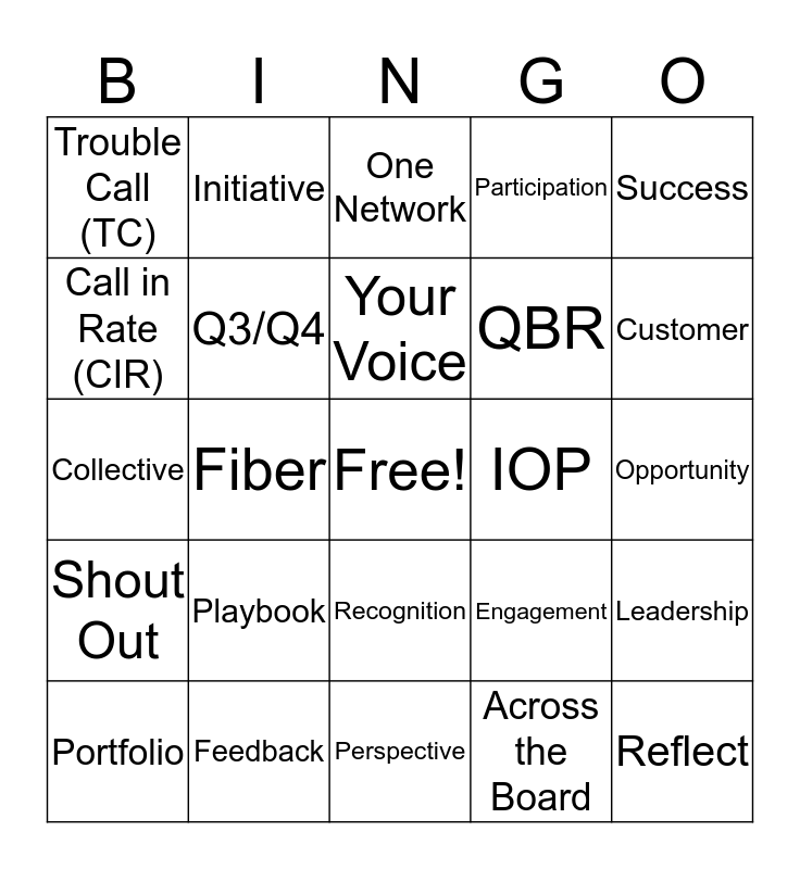 This bingo card has a free space and 25 words: Playbook, Perspective, Your Voice, Portfolio, Success, Trouble Call (TC), Call in Rate (CIR), Initiative, IOP, Recognition, QBR, Collective, Engagement, Leadership, Q3/Q4, eNPS, Opportunity, One Network, Customer, Fiber, Reflect, Feedback, Shout Out, Participation and Across the Board.