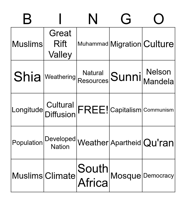 This bingo card has a free space and 40 words: Latitude, Longitude, Geography, Weathering, Climate, Weather, Natural Resources, Nonrenewable Resources, Culture, Population, Cultural Diffusion, Migration, Democracy, Communism, Capitalism, Developed Nation, OPEC, Muslims, Five Pillars, Muhammad, Qu'ran, Mosque, Sunni, Shia, Dead Sea, Damascus, Israel, Hebrews, West Bank, Istanbul, Judaism, Muslims, Gold/ Salt, Apartheid, Nelson Mandela, South Africa, Rosetta Stone, Ancient Kush, Great Rift Valley and Mt. Killaminjaro.