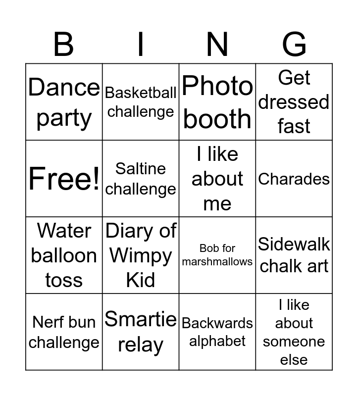 This bingo card has 16 words: Smartie relay, Sidewalk chalk art, Photo booth, Dance party, Water balloon toss, Basketball challenge, Bob for marshmallows, Backwards alphabet, Free!, Saltine challenge, Nerf bun challenge, Get dressed fast, Diary of Wimpy Kid, Charades, I like about me and I like about someone else.