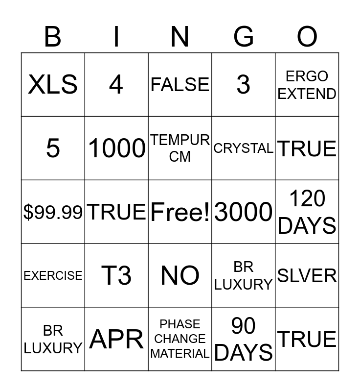 This bingo card has a free space and 24 words: T3, APR, TEMPUR CM, BR LUXURY, ERGO EXTEND, XLS, 5, 4, 3000, NO, CRYSTAL, $99.99, BR LUXURY, SLVER, 1000, 90 DAYS, 120 DAYS, FALSE, TRUE, TRUE, TRUE, EXERCISE, 3 and PHASE CHANGE MATERIAL.