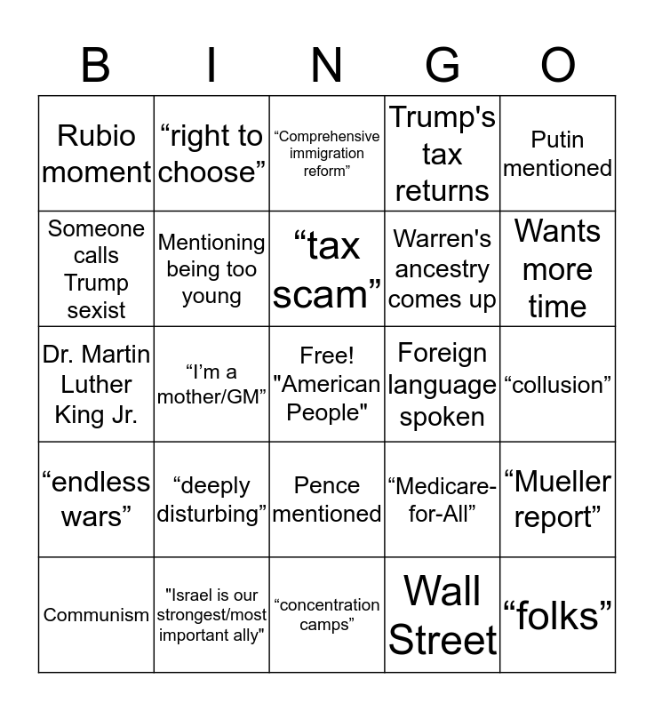 This bingo card has a free space and 48 words: “Game of Thrones”, “folks”, “one-tenth of one percent”, “concentration camps”, “deeply disturbing”, Male interrupts female cand., “right to choose”, Someone calls Trump racist, Someone calls Trump sexist, Mentioning being too old, Mentioning being too young, Trump's tax returns, “Mueller report”, “Medicare-for-All”, “millionaires and billionaires”, “let me be clear”, “tax scam”, Foreign language spoken, Hillary mentioned, Putin mentioned, “I’m a mother/GM”, Wall Street, Rubio moment, Warren's ancestry comes up, “Obamacare”, Wants more time, Communism, “pay their fair share”, Pence mentioned, “endless wars”, Should impeach, Shouldn’t impeach, Trump’s golfing mentioned, Abolish ICE, "Israel is our strongest/most important ally", Iran nuclear deal, “Assault-style” weapons, “collusion”, Gerrymandering, “common sense”, Admits to using marijuana, “Dreamers”, “Comprehensive immigration reform”, Anecdote about farmer, etc., Dr. Martin Luther King Jr., “Green New Deal”, Voting rights for prisoners and Someone mentions a sports team.