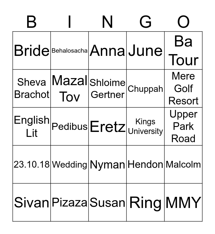 This bingo card has 25 words: Wedding, Susan, Shloime Gertner, Sivan, Ba Tour, Bride, Sheva Brachot, Behalosacha, Kings University, Nyman, Chuppah, English Lit, Hendon, Malcolm, Mazal Tov, MMY, Upper Park Road, Anna, Mere Golf Resort, Pedibus, Eretz, Pizaza, 23.10.18, June and Ring.