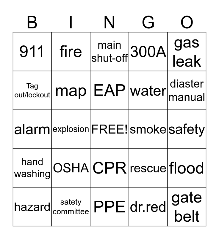 This bingo card has a free space and 24 words: OSHA, satety committee, EAP, hazard, gas leak, 911, Tag out/lockout, fire, smoke, CPR, water, alarm, rescue, flood, map, dr.red, safety, main shut-off, diaster manual, explosion, gate belt, hand washing, 300A and PPE.