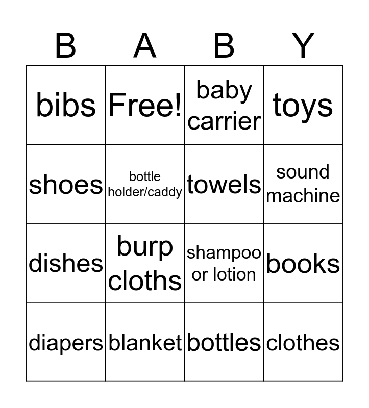This bingo card has 19 words: shampoo or lotion, pacifiers, baby carrier, clothes, books, shoes, bottles, bibs, Free!, dishes, burp cloths, bottle holder/caddy, towels, blanket, diapers, crib or changing table sheet, toys, sound machine and gift card.