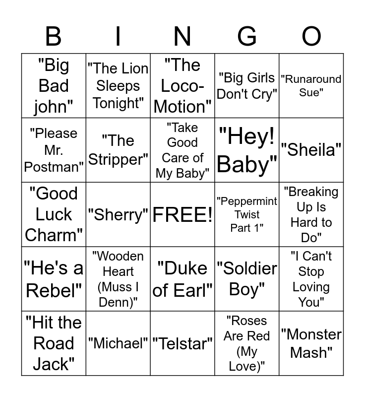 This bingo card has a free space and 24 words: "Wooden Heart (Muss I Denn)", "Michael", "Take Good Care of My Baby", "Hit the Road Jack", "Runaround Sue", "Big Bad john", "Please Mr. Postman", "The Lion Sleeps Tonight", "Peppermint Twist Part 1", "Duke of Earl", "Hey! Baby", "Good Luck Charm", "Soldier Boy", "I Can't Stop Loving You", "The Stripper", "Roses Are Red (My Love)", "Breaking Up Is Hard to Do", "The Loco- Motion", "Sheila", "Sherry", "Monster Mash", "He's a Rebel", "Big Girls Don't Cry" and "Telstar".