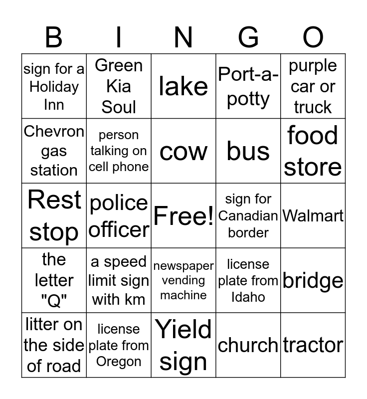 This bingo card has a free space and 24 words: a speed limit sign with km, license plate from Oregon, cow, litter on the side of road, purple car or truck, sign for a Holiday Inn, Chevron gas station, Green Kia Soul, sign for Canadian border, newspaper vending machine, bus, Rest stop, license plate from Idaho, bridge, person talking on cell phone, church, Walmart, lake, food store, police officer, tractor, the letter "Q", Port-a-potty and Yield sign.