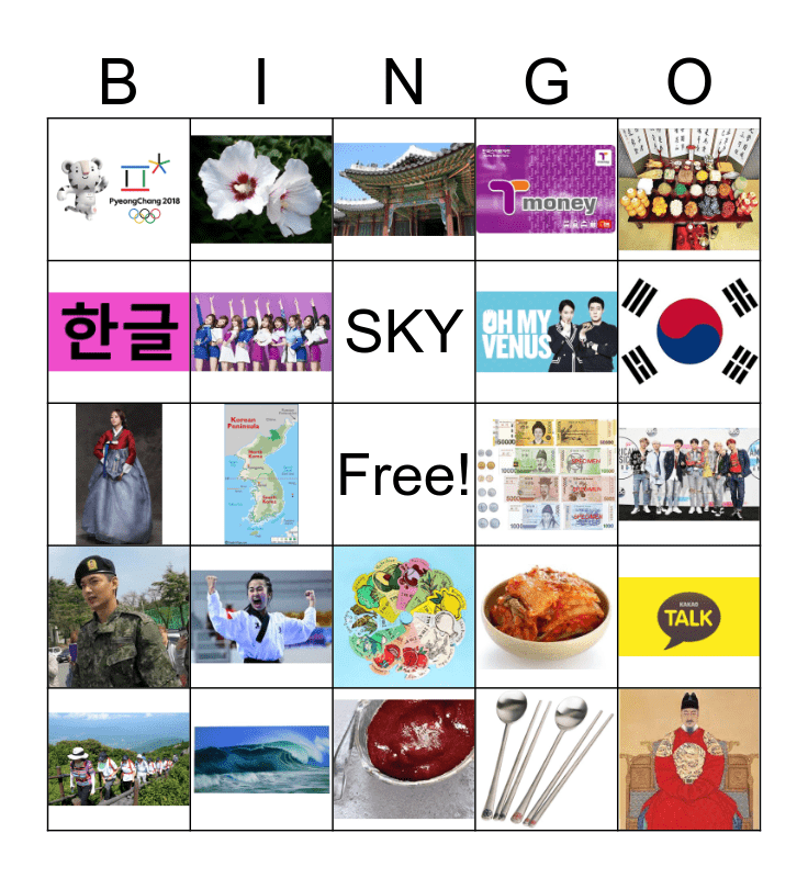 This bingo card has 23 images, a free space and 2 words: SKY and DMZ.