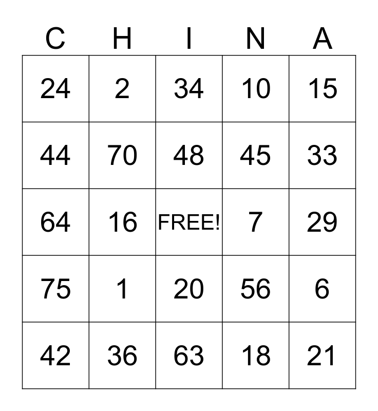 This bingo card has a free space and 24 words: 1, 36, 48, 42, 15, 24, 44, 2, 7, 20, 45, 64, 56, 6, 70, 18, 29, 34, 33, 16, 21, 75, 10 and 63.