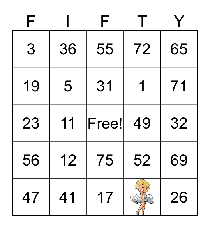 This bingo card has 1 images, a free space and 24 words: 12, 17, 31, 47, 65, 3, 19, 36, 49, 75, 1, 23, 52, 69, 5, 25, 32, 55, 71, 11, 26, 41, 56 and 72.