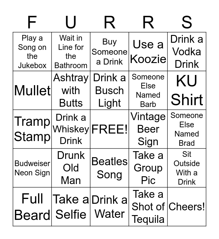 This bingo card has a free space and 24 words: Drunk Old Man, Take a Selfie, Drink a Busch Light, Full Beard, Drink a Vodka Drink, Play a Song on the Jukebox, Mullet, Wait in Line for the Bathroom, Vintage Beer Sign, Beatles Song, Someone Else Named Barb, Tramp Stamp, Take a Group Pic, Sit Outside With a Drink, Ashtray with Butts, Take a Shot of Tequila, Someone Else Named Brad, Buy Someone a Drink, KU Shirt, Drink a Whiskey Drink, Cheers!, Budweiser Neon Sign, Use a Koozie and Drink a Water.