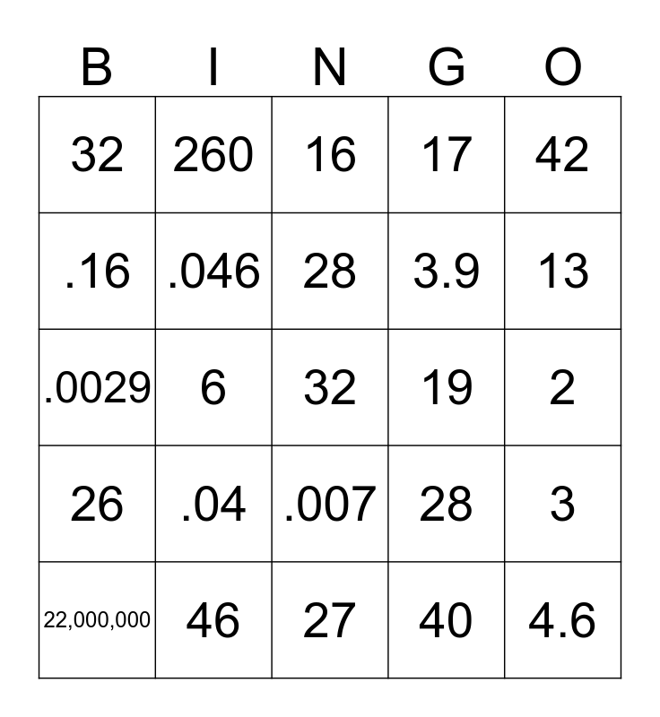 This bingo card has 32 words: 40, .035, 6, 43, 26, .046, 42, 3, 260, 4.6, 28, 16, 1.6, 4500, 19, 0.2, 22,000,000, .0029, .007, .04, 28, 34, 2, 46, 32, 17, 3.9, .16, 32, 27, 32 and 13.