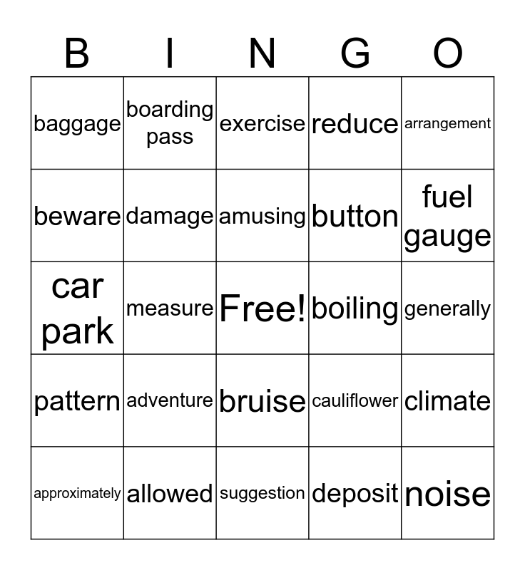 This bingo card has a free space and 24 words: adventure, allowed, amusing, approximately, arrangement, baggage, beware, boarding pass, boiling, bruise, button, car park, cauliflower, climate, damage, deposit, generally, exercise, fuel gauge, measure, noise, pattern, reduce and suggestion.