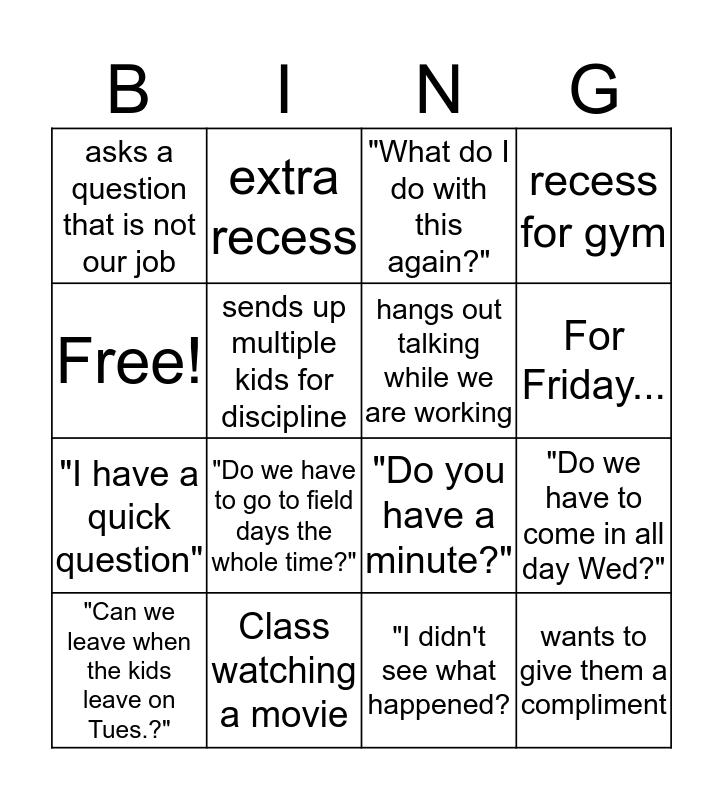 This bingo card has 16 words: Class watching a movie, "Do we have to come in all day Wed?", "What do I do with this again?", asks a question that is not our job, "I have a quick question", extra recess, "Do you have a minute?", "I didn't see what happened?, Free!, sends up multiple kids for discipline, "Can we leave when the kids leave on Tues.?", recess for gym, "Do we have to go to field days the whole time?", For Friday..., hangs out talking while we are working and wants to give them a compliment.