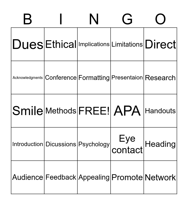 This bingo card has a free space and 24 words: Dicussions, Feedback, Formatting, Audience, Direct, Dues, Acknowledgments, Ethical, APA, Psychology, Presentaion, Smile, Eye contact, Heading, Conference, Promote, Handouts, Implications, Research, Methods, Network, Introduction, Limitations and Appealing.