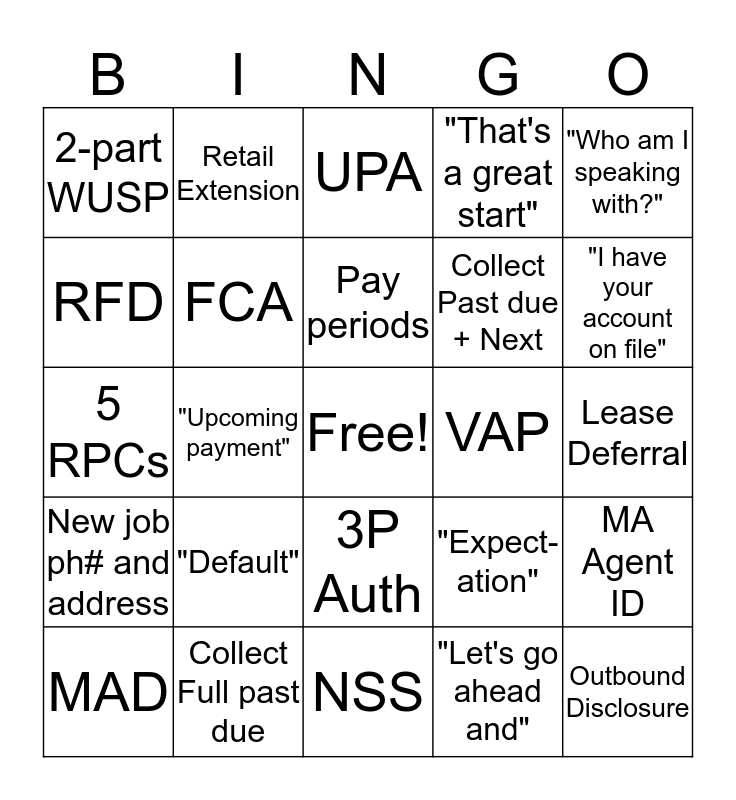 This bingo card has a free space and 24 words: "Default", Collect Full past due, Pay periods, MAD, "Who am I speaking with?", 2-part WUSP, RFD, Retail Extension, VAP, 3P Auth, Collect Past due + Next, 5 RPCs, "Expect-ation", MA Agent ID, FCA, "Let's go ahead and", Lease Deferral, UPA, "I have your account on file", "Upcoming payment", Outbound Disclosure, New job ph# and address, "That's a great start" and NSS.
