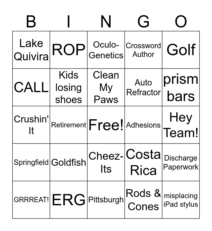 This bingo card has a free space and 24 words: Goldfish, ERG, Clean My Paws, GRRREAT!, Golf, Lake Quivira, CALL, ROP, Adhesions, Cheez-Its, Auto Refractor, Crushin' It, Costa Rica, Discharge Paperwork, Kids losing shoes, Rods & Cones, Hey Team!, Oculo-Genetics, prism bars, Retirement, misplacing iPad stylus, Springfield, Crossword Author and Pittsburgh.