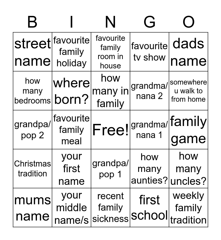 This bingo card has a free space and 24 words: your first name, your middle name/s, how many in family, mums name, dads name, street name, how many bedrooms, favourite family holiday, grandma/ nana 1, grandpa/ pop 1, grandma/ nana 2, grandpa/ pop 2, how many aunties?, how many uncles?, where born?, first school, family game, favourite family room in house, somewhere u walk to from home, favourite family meal, weekly family tradition, Christmas tradition, favourite tv show and recent family sickness.