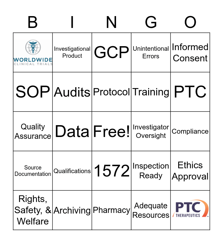 This bingo card has 2 images, a free space and 22 words: Rights, Safety, & Welfare, Qualifications, Protocol, Adequate Resources, Informed Consent, Investigational Product, GCP, Investigator Oversight, Compliance, Quality Assurance, Audits, Inspection Ready, Ethics Approval, SOP, Archiving, Pharmacy, Unintentional Errors, PTC, Source Documentation, Data, 1572 and Training.