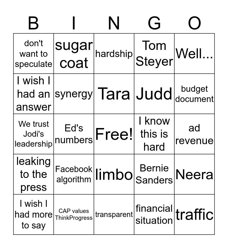 This bingo card has a free space and 24 words: Facebook algorithm, CAP values ThinkProgress, Tara, I wish I had more to say, Well..., don't want to speculate, I wish I had an answer, sugar coat, I know this is hard, limbo, Judd, We trust Jodi's leadership, Bernie Sanders, Neera, synergy, financial situation, ad revenue, hardship, budget document, Ed's numbers, traffic, leaking to the press, Tom Steyer and transparent.