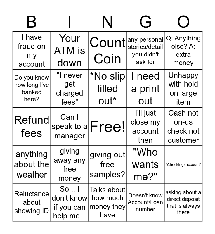 This bingo card has a free space and 24 words: giving away any free money, So... I don't know if you can help me..., *No slip filled out*, Reluctance about showing ID, Q: Anything else? A: extra money, I have fraud on my account, Do you know how long I've banked here?, Your ATM is down, I'll just close my account then, giving out free samples?, I need a print out, Refund fees, "Who wants me?", "Checkingsaccount", "I never get charged fees", Doesn't know Account/Loan number, Cash not on-us check not customer, Count Coin, Unhappy with hold on large item, Can I speak to a manager, asking about a direct deposit that is always there, anything about the weather, any personal stories/detail you didn't ask for and Talks about how much money they have.