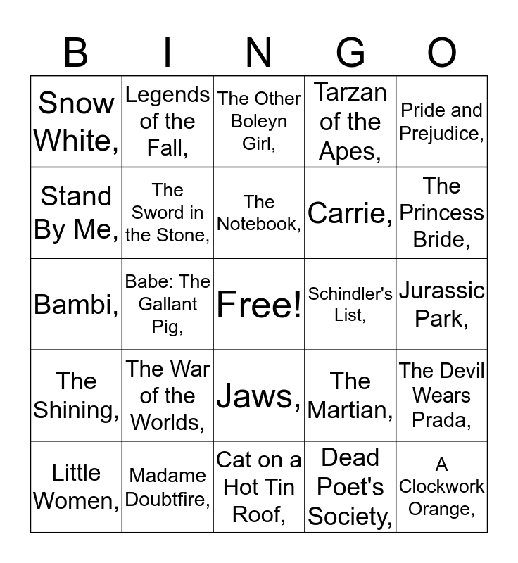 This bingo card has a free space and 86 words: Bird Box,, Crazy Rich Asians,, Jaws,, Lord of the Rings: The Two Towers,, Harry Potter and the Socerer's Stone,, The Godfather,, Pinocchio,, The Jungle Book,, 101 Dalmations,, The Exorcist,, Gone With the Wind,, Forrest Gump,, The Devil Wears Prada,, Jurassic Park,, Mary Poppins,, The Notebook,, Stuart Little,, Shrek!,, Jumanji,, Fight Club,, The Silence of the Lambs,, The Wizard of Oz,, Bambi,, Bridget Jones's Diary,, Dead Poet's Society,, Peter Pan,, The Princess Diaries,, Apollo 13,, The Phantom of the Opera,, Legally Blonde,, Madame Doubtfire,, Matilda,, Memoirs of a Geisha,, The War of the Worlds,, Stand By Me,, Marley and Me,, The Princess Bride,, Planet of the Apes,, The Neverending Story,, Babe: The Gallant Pig,, Girl Interrupted,, Psycho,, Twilight,, Schindler's List,, The Green Mile,, Pride and Prejudice,, Journey to the Center of the Earth,, Legends of the Fall,, One Flew Over the Cuckoo's Nest,, About a Boy,, Charlotte's Web,, The Lost World,, The Shining,, The Boy in the Striped Pajamas,, Misery,, The Prestige,, Coraline,, Carrie,, Tarzan of the Apes,, The Sword in the Stone,, Snow White,, The Help,, The Gangs of New York,, The Graduate,, Atonement,, The Other Boleyn Girl,, The English Patient,, A Clockwork Orange,, No Country for Old Men,, The Hunger Games,, Cold Mountain,, Life of Pi,, Little Women,, Inkheart,, To Kill a Mockingbird,, The Perfect Storm,, Cat on a Hot Tin Roof,, Gentlemen Prefer Blondes,, Gone Girl,, The Third Man,, Drive,, Revolutionary Road,, The Fault in Our Stars,, East of Eden,, The Martian, and Ella Enchanted,.