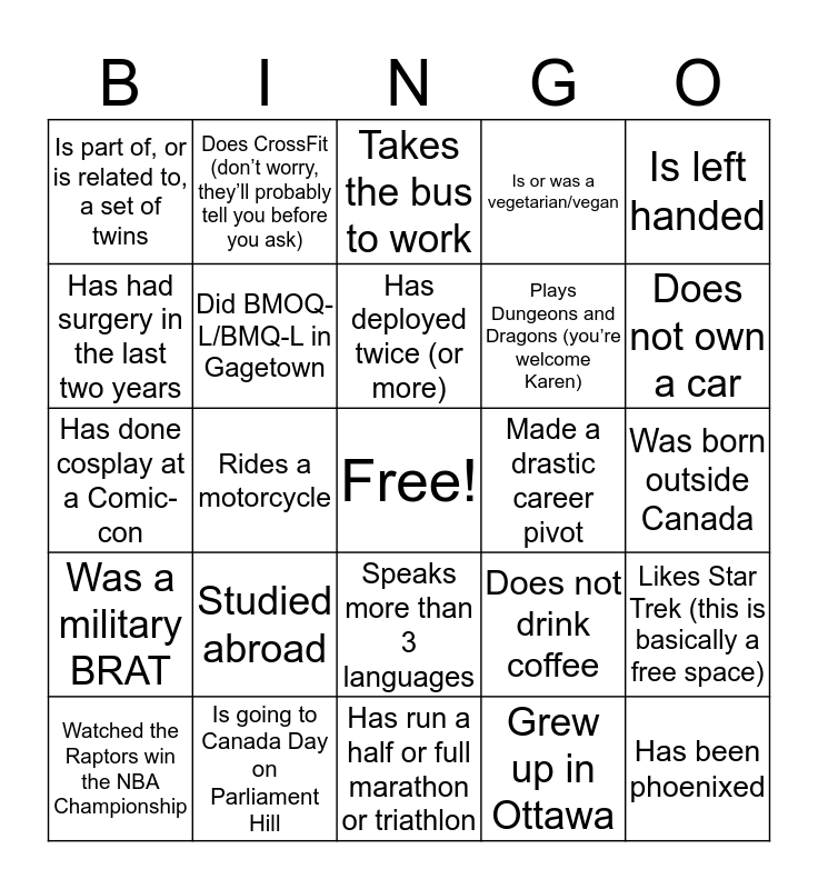 This bingo card has a free space and 39 words: Has taken dance lessons for fun, Plays on multiple sports teams each week (different sports), Has gone skydiving, Did BMOQ-L/BMQ-L in Gagetown, Watched the Raptors win the NBA Championship, Speaks more than 3 languages, Has deployed twice (or more), Has been to 7 continents, Is left handed, Was a military BRAT, Rides a motorcycle, Is or was a vegetarian/vegan, Has been phoenixed, Was born outside Canada, Made a drastic career pivot, Studied abroad, Has an anaphylactic allergy, Is part of, or is related to, a set of twins, Has been to more than seven provinces and territories, Does not drink coffee, Has had surgery in the last two years, Has run a half or full marathon or triathlon, Plays Dungeons and Dragons (you’re welcome Karen), Does not own a car, Has a non-driver’s license (e.g., pilot, scuba, PAL, Hunting etc.), Has been at the Command for less than 6 months, Has a child under 3 yo, Was/is a lifeguard, Has met a Prime Minister/President (any country), Does CrossFit (don’t worry, they’ll probably tell you before you ask), Has been at the Command for more than 3 years, Knows a circus skill (e.g. juggling/unicycle), Takes the bus to work, Is going to Canada Day on Parliament Hill, Grew up in Ottawa, Lives in Farrhaven (Barrhaven), Likes Star Trek (this is basically a free space), Has done cosplay at a Comic-con and Owns a lightsaber.