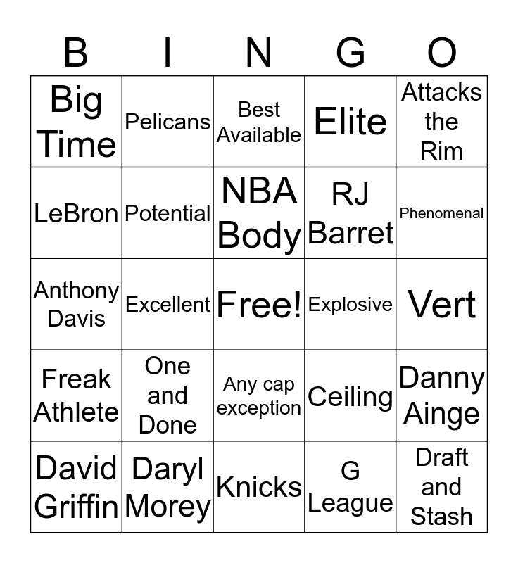 This bingo card has a free space and 36 words: Wingspan, Long Arms, Upside, Potential, Ceiling, Freak Athlete, NBA Body, BB IQ, Attacks the Rim, Stretches the Floor, Excellent, Elite, Dynamic, Explosive, Phenomenal, Big Time, Multi-Dimensional, One and Done, Draft and Stash, Best Available, Vert, Danny Ainge, Daryl Morey, David Griffin, Knicks, Pelicans, Anthony Davis, Zion, RJ Barret, LeBron, Lavar or his kids, Motor, G League, Any cap exception, Bird Rights and Thankful for opporunity.