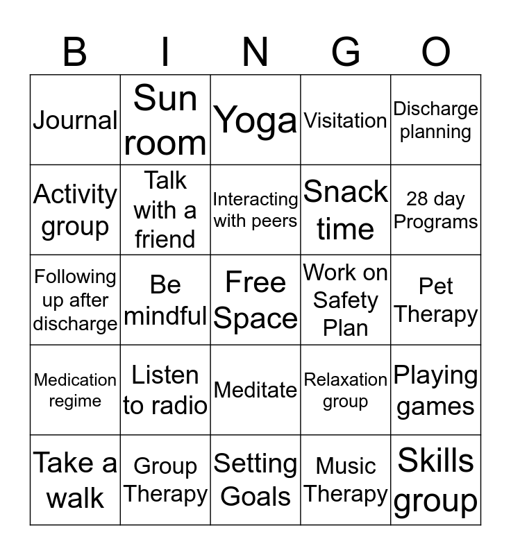 This bingo card has a free space and 29 words: Take a walk, Just breathe, Be mindful, Watch TV, Journal, Yoga, Talk with a friend, Listen to radio, Work on Safety Plan, Group Therapy, Pet Therapy, Skills group, Setting Goals, Music Therapy, 28 day Programs, Taking care of whole self, Meditate, Medication regime, Discharge planning, Following up after discharge, Relaxation group, AA/NA meeting, Snack time, Activity group, Visitation, Sun room, Playing games, Interacting with peers and WII.