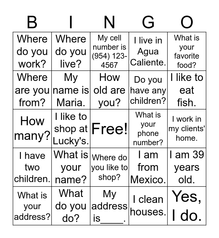 This bingo card has a free space and 24 words: What is your name?, What do you do?, How old are you?, What is your address?, What is your favorite food?, Where do you work?, Where are you from?, Where do you live?, What is your phone number?, Where do you like to shop?, Do you have any children?, How many?, I am from Mexico., I am 39 years old., My name is Maria., I clean houses., I work in my clients' home., My cell number is (954) 123-4567, I like to eat fish., I like to shop at Lucky's., Yes, I do., I have two children., I live in Agua Caliente. and My address is____..
