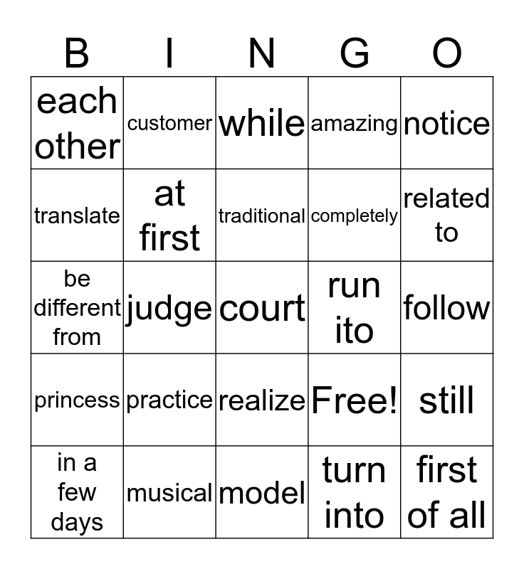This bingo card has 25 words: practice, model, traditional, in a few days, notice, each other, translate, customer, run ito, realize, completely, be different from, Free!, still, at first, first of all, follow, while, related to, judge, court, musical, princess, amazing and turn into.