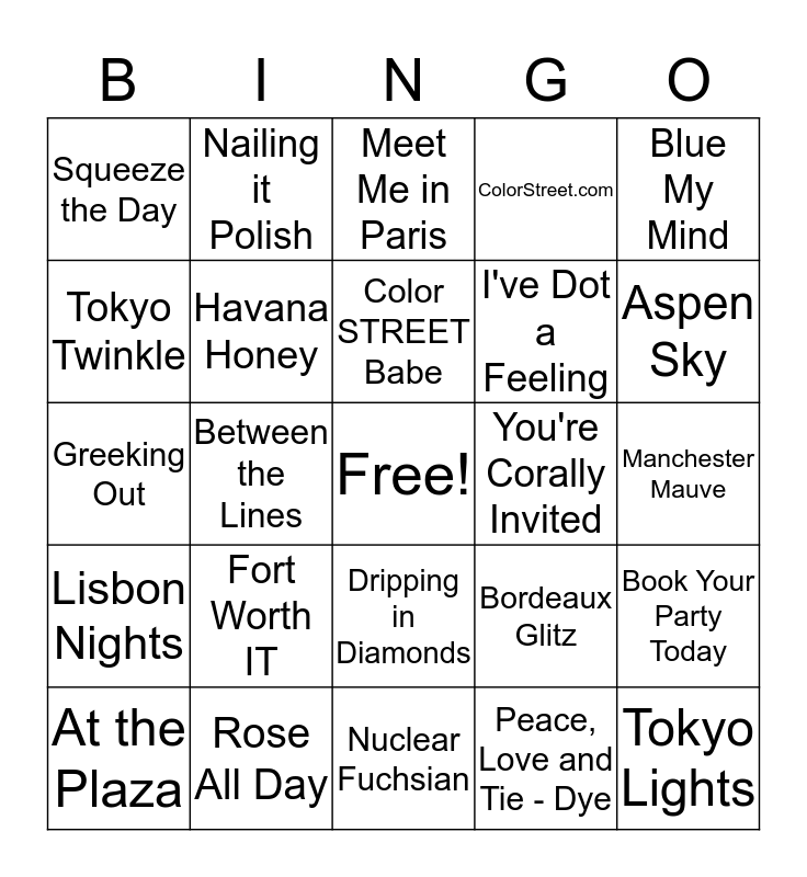 This bingo card has a free space and 29 words: At the Plaza, Party in the USA, Between the Lines, Fa-la-la, Squeeze the Day, Meet Me in Paris, Havana Honey, Fort Worth IT, You're Corally Invited, Rose All Day, Manchester Mauve, Tokyo Lights, Nuclear Fuchsian, Peace, Love and Tie - Dye, Aspen Sky, Tinseltown, Dripping in Diamonds, Lisbon Nights, Blue My Mind, Greeking Out, Bordeaux Glitz, Water You Up To ?, I've Dot a Feeling, Tokyo Twinkle, ColorStreet.com, Nailing it Polish, Book Your Party Today, Color STREET Babe and Be Colorful, Be Brilliant, Be Color Street.