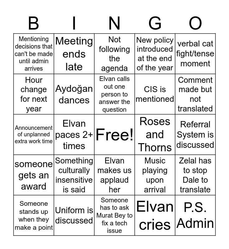 This bingo card has a free space and 32 words: Elvan cries, Everyone claps, Elvan paces 2+ times, They tell us to change seats/move to the front, someone gets an award, Aydoğan dances, verbal cat fight/tense moment, Zelal has to stop Dale to translate, Meeting ends late, Meeting starts late, Elvan calls out one person to answer the question, Not following the agenda, Someone falls asleep, Ayşe Hande is asked to translate, Roses and Thorns, Aydoğan makes a video, Someone stands up when they make a point, Announcement of unplanned extra work time, Elvan makes us applaud her, Something culturally insensitive is said, Music playing upon arrival, Teachers get reprimanded, Referral System is discussed, Uniform is discussed, P.S. Admin, New policy introduced at the end of the year, CIS is mentioned, Hour change for next year, Mentioning decisions that can't be made until admin arrives, Someone has to ask Murat Bey to fix a tech issue, Admin on phone/texting and Comment made but not translated.