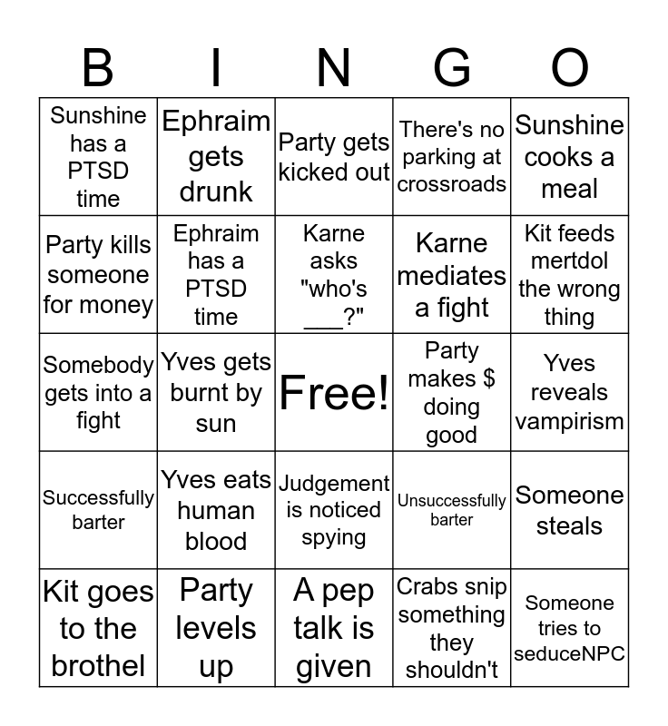 This bingo card has a free space and 24 words: Yves eats human blood, Party levels up, Karne asks "who's ___?", Kit goes to the brothel, Sunshine cooks a meal, Sunshine has a PTSD time, Party kills someone for money, Ephraim gets drunk, Party makes $ doing good, Judgement is noticed spying, Karne mediates a fight, Somebody gets into a fight, Unsuccessfully barter, Someone steals, Ephraim has a PTSD time, Crabs snip something they shouldn't, Yves reveals vampirism, Party gets kicked out, Kit feeds mertdol the wrong thing, Yves gets burnt by sun, Someone tries to seduceNPC, Successfully barter, There's no parking at crossroads and A pep talk is given.