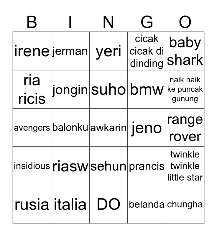 This bingo card has a free space and 24 words: riasw, italia, suho, rusia, baby shark, irene, ria ricis, jerman, jeno, sehun, bmw, avengers, prancis, twinkle twinkle little star, jongin, belanda, range rover, yeri, naik naik ke puncak gunung, balonku, chungha, insidious, cicak cicak di dinding and DO.