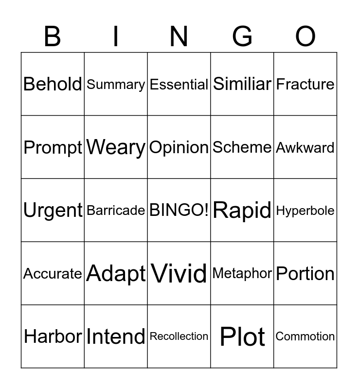 This bingo card has a free space and 24 words: Adapt, Intend, Opinion, Harbor, Fracture, Behold, Prompt, Summary, Rapid, Vivid, Scheme, Urgent, Metaphor, Portion, Weary, Plot, Hyperbole, Essential, Awkward, Barricade, Commotion, Accurate, Similiar and Recollection.