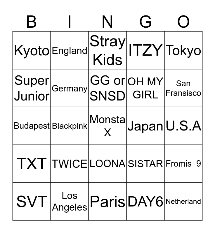 This bingo card has 25 words: TWICE, Paris, GG or SNSD, SVT, Tokyo, Kyoto, Super Junior, England, Japan, LOONA, OH MY GIRL, Budapest, SISTAR, Fromis_9, Germany, Netherland, U.S.A, Stray Kids, San Fransisco, Blackpink, Monsta X, Los Angeles, TXT, ITZY and DAY6.