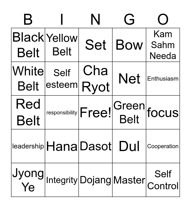 This bingo card has a free space and 25 words: Hana, Dojang, Cha Ryot, Jyong Ye, Kam Sahm Needa, Black Belt, White Belt, Yellow Belt, Green Belt, Dasot, Net, Red Belt, Dul, Cooperation, Self esteem, Self confidence, focus, Set, Enthusiasm, responsibility, Self Control, Integrity, leadership, Bow and Master.