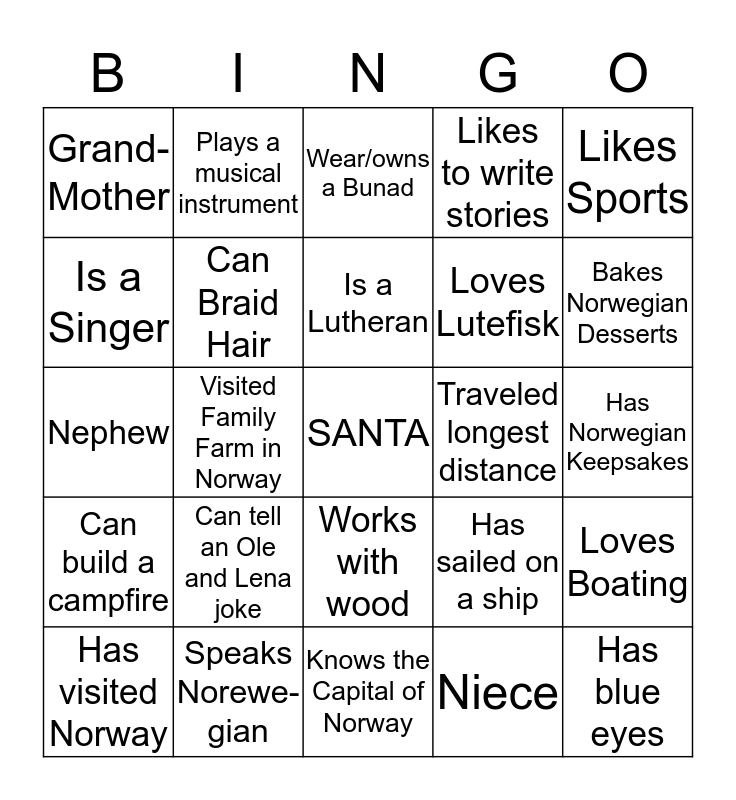 This bingo card has a free space and 29 words: Has visited Norway, Can Knit, Visited Family Farm in Norway, Oldest, Grand- Mother, Wear/owns a Bunad, Can Braid Hair, Can tell an Ole and Lena joke, Traveled longest distance, Speaks Norewe- gian, Has Norwegian Keepsakes, Has blue eyes, Knows the Capital of Norway, Niece, Bakes Norwegian Desserts, Rose- maling artist, Works with wood, Can build a campfire, Likes Sports, Nephew, Has sailed on a ship, Youngest, Loves Lutefisk, Is a Singer, Likes to write stories, Plays a musical instrument, Loves Boating, Is a Lutheran and Likes Winter.