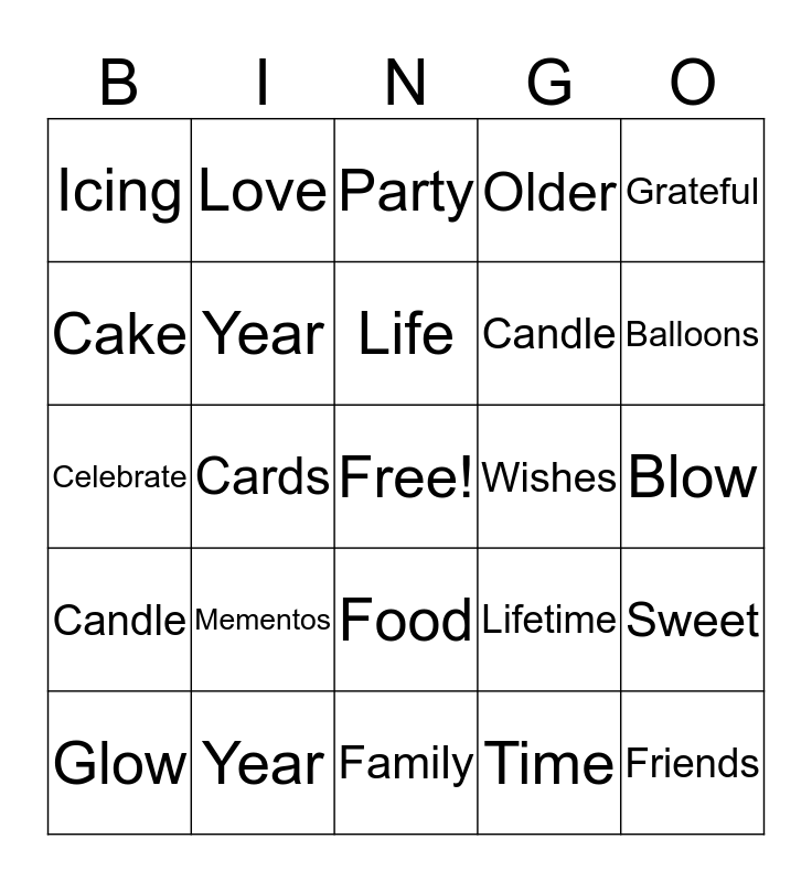 This bingo card has a free space and 24 words: Mementos, Year, Life, Glow, Grateful, Icing, Cake, Love, Wishes, Food, Candle, Celebrate, Lifetime, Sweet, Year, Time, Blow, Party, Balloons, Cards, Friends, Candle, Older and Family.