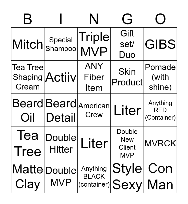 This bingo card has a free space and 24 words: Double Hitter, Double MVP, ANY Fiber Item, Matte Clay, GIBS, Mitch, Tea Tree Shaping Cream, Special Shampoo, Liter, Liter, Skin Product, Beard Oil, Double New Client MVP, MVRCK, Actiiv, Style Sexy, Anything RED (Container), Triple MVP, Pomade (with shine), Beard Detail, Con Man, Tea Tree, Gift set/ Duo and Anything BLACK (container).