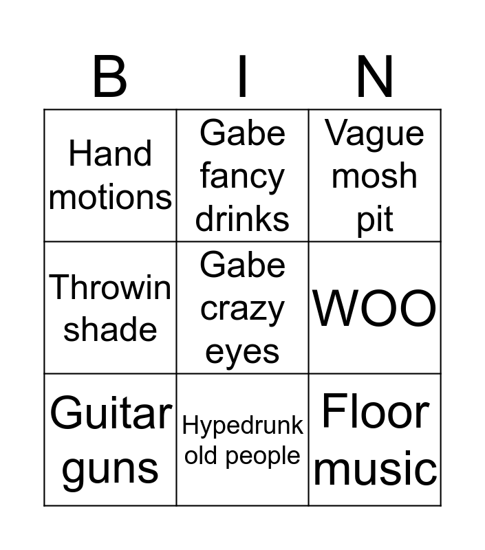 This bingo card has 9 words: Guitar guns, Vague mosh pit, Gabe fancy drinks, Throwin shade, Hand motions, WOO, Gabe crazy eyes, Floor music and Hypedrunk old people.